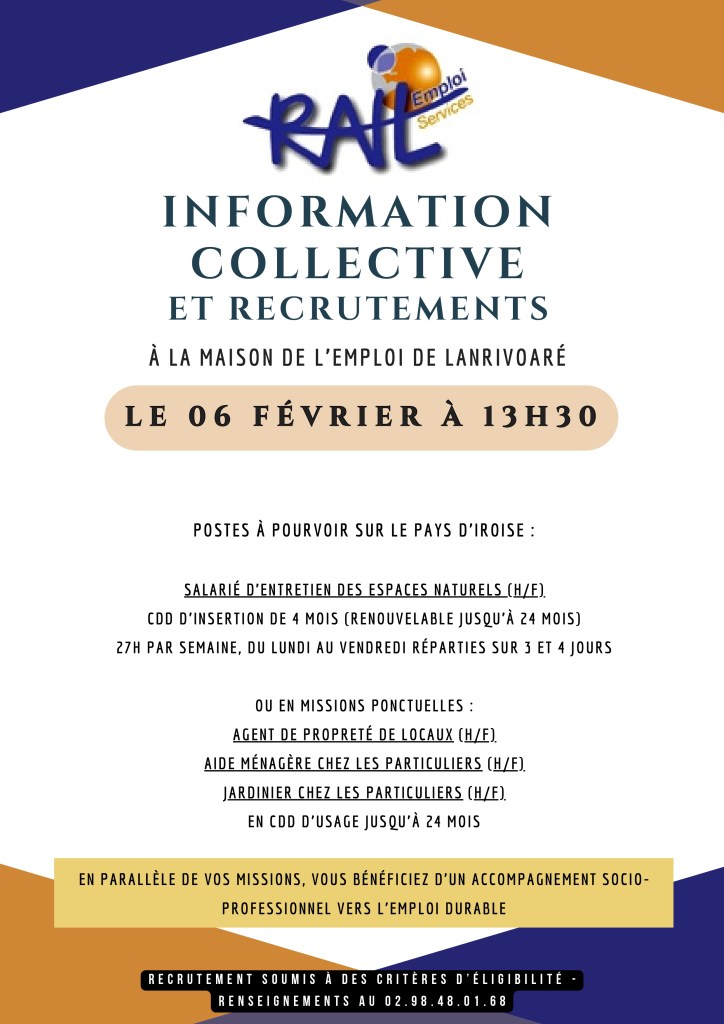 Le RAIL Emploi Services ouvre ses recrutements pour le début d’année 2024 pour des postes sur le chantier d’insertion et l’association intermédiaire. Ceux ci vous sont ouverts si vous êtes demandeur d’emploi, bénéficiaire des minima-sociaux ou accompagné dans vos recherches par un organisme (Pôle Emploi, CAP Emploi, Mission Locale, PLIE, CDAS, centres de formation…). Retrouvez plus d’infos sur ce site, par mail à contact@rail-emploi-services.fr ou par téléphone au 02.98.48.01.68.